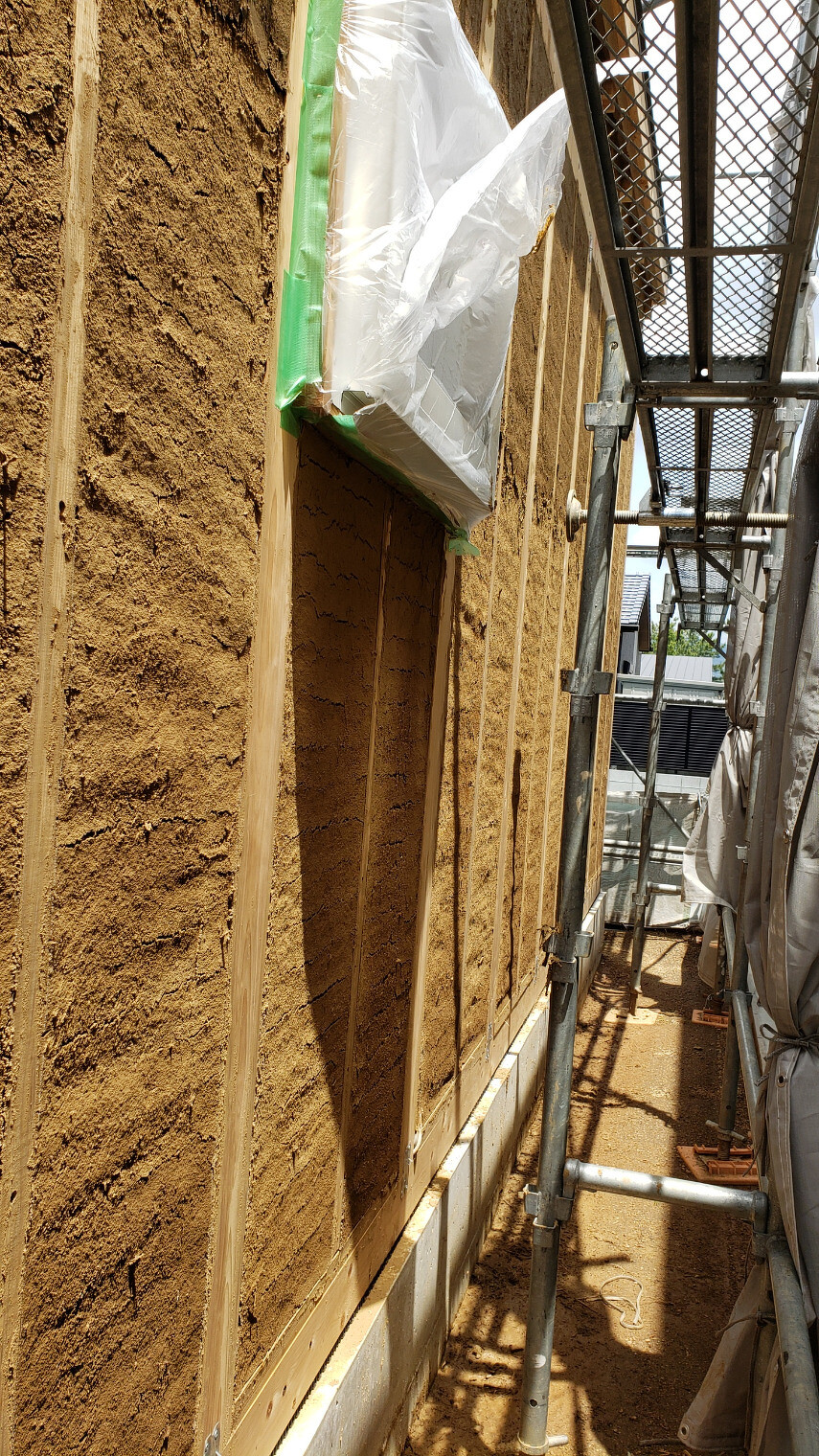 土壁が乾きました! 断熱材を入れ、透湿防水シートを貼っていき、その上から胴縁で下地を打っていきます。 この後はガルバリウムを貼っていきます。