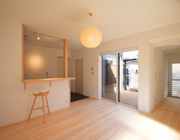外壁は上品なアイボリーホワイトを採用し、清潔感と温かみを。玄関には木目調の引戸を設置し、自然な風合いと落ち着いた雰囲気を演出。サッシはシャンパングレイの色合いで、全体のデザインに調和をもたらし、洗練された印象を。玄関にはオリジナルの造作下駄箱を設置し、収納もスマートに。廊下のないオープンプランの間取りにより、洋室のスライドドアを開けると、広々とした一つの空間が広がります。自然光がたっぷりと差し込み、快適で開放的な居住空間。