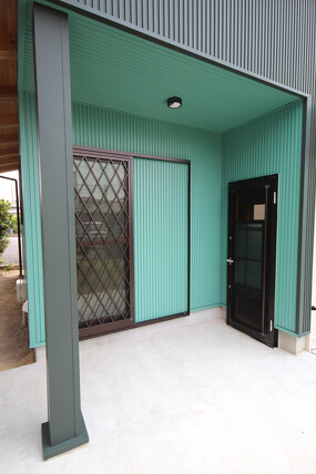 外観正面は、落ち着いた印象を与えるモスグリーンのガルバリウム鋼板を。