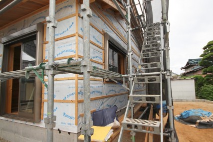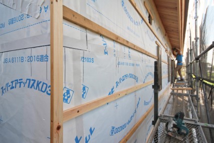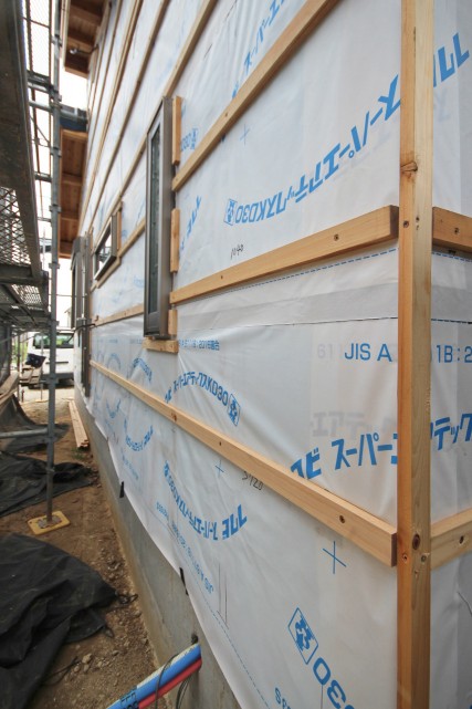 透湿シートの上から下地がつけられ、これから外壁へ進みます。