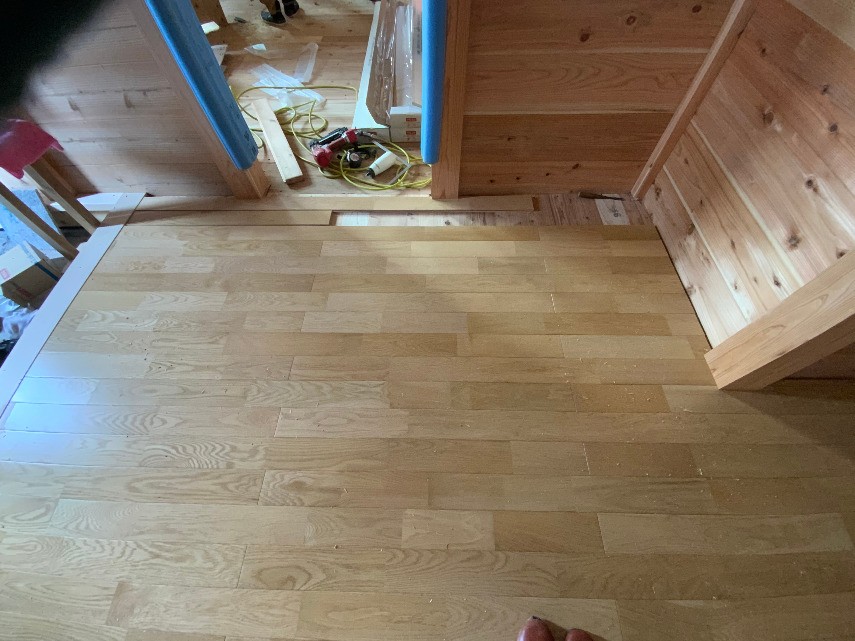 1階はナラのフローリングです。玄関ホールのあたりが貼れてきました。