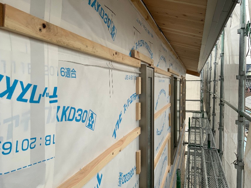 外壁の下地が付けられました。 いろいろな部分の作業が並行して進んでいきます。