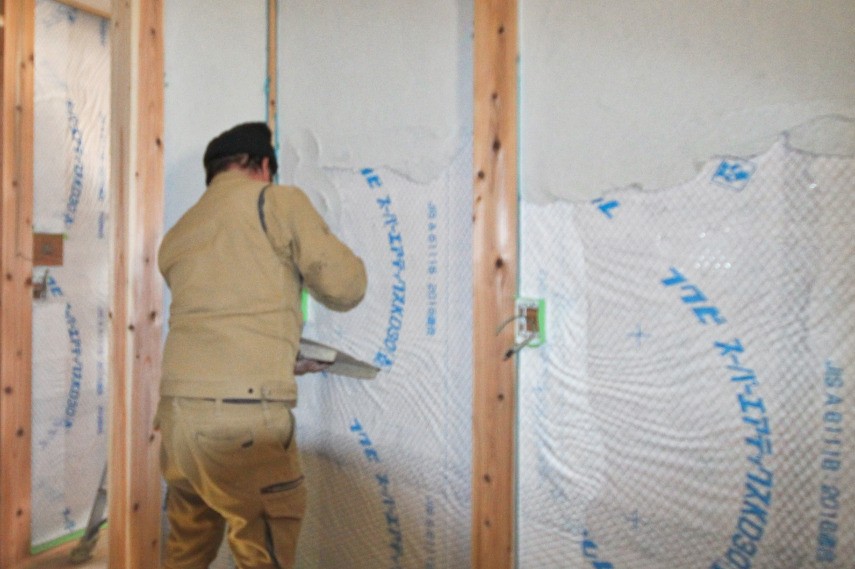 キッチンには防火仕様の瀬戸漆喰を塗っていきます。