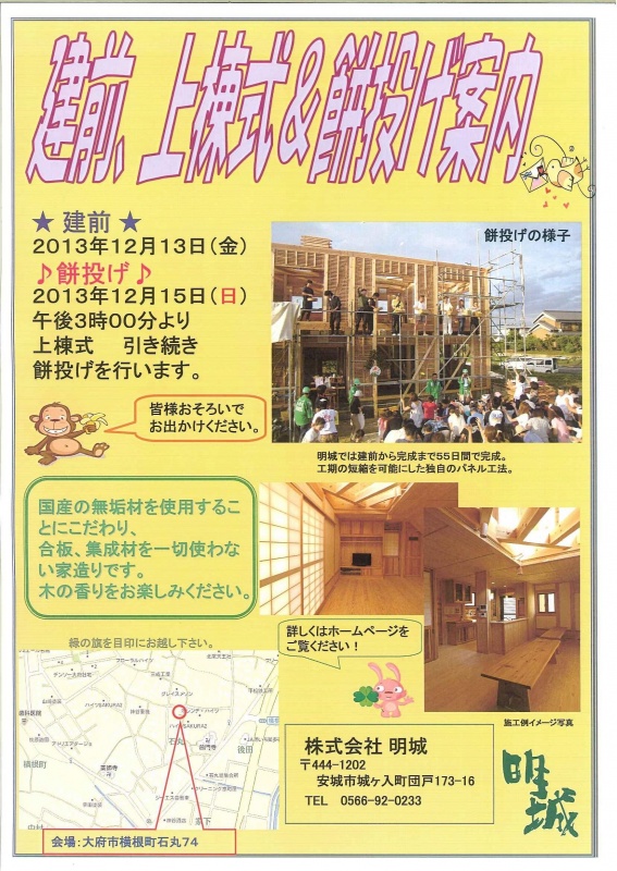 | コメント | ご近所へのお披露目!上棟式と餅投げを行います。みなさん ご家族 お友達をお誘いの上 是非ご来場ください。 |