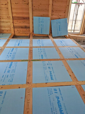 床組です。この段階で先行配管を通しておきます。 床組後は断熱材を入れて床板を貼っていきます。