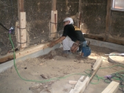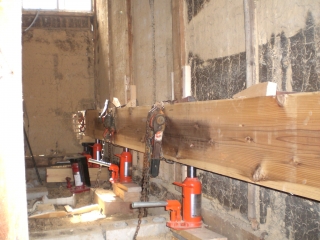 私もこの様な仕事をした事があるかな〜補強柱を大引きの上から建てている、今回基礎から建てる様に直す、壁については隣に補強します、