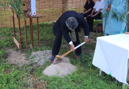 地鎮祭を行いました。 工事の無事を祈り、神職をお招きして神様にお供え物をし、祝詞をあげ、お祓いをして清め、最初の鍬や鋤を入れます。