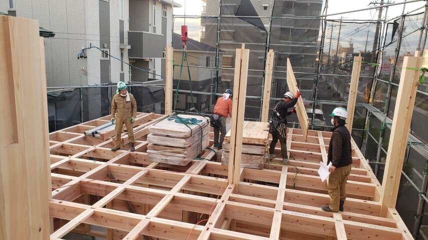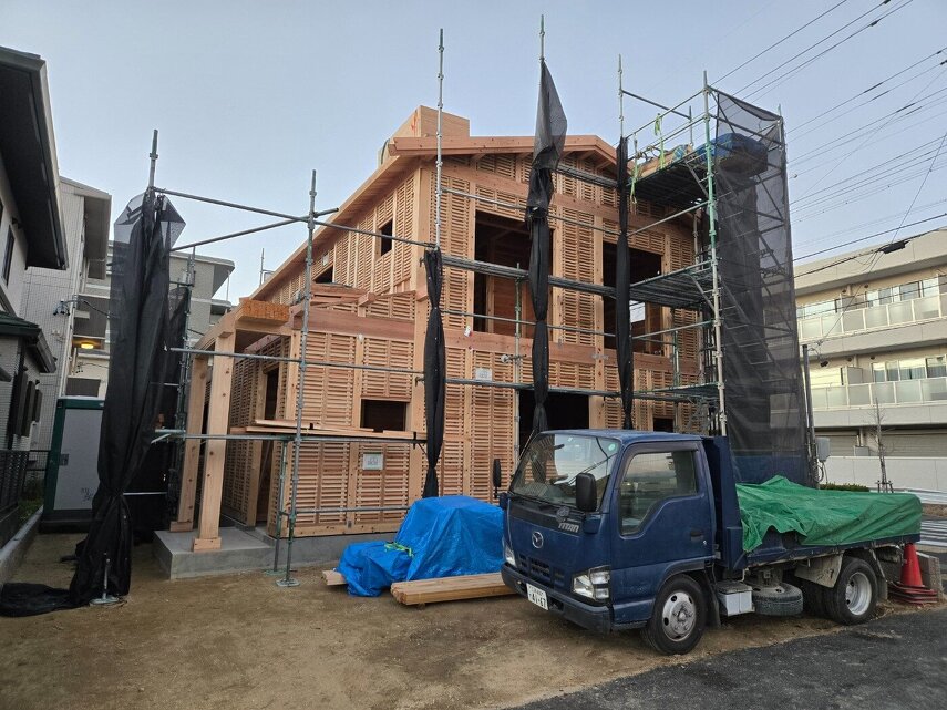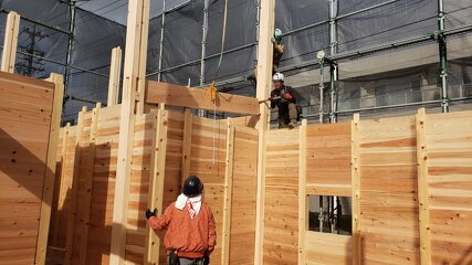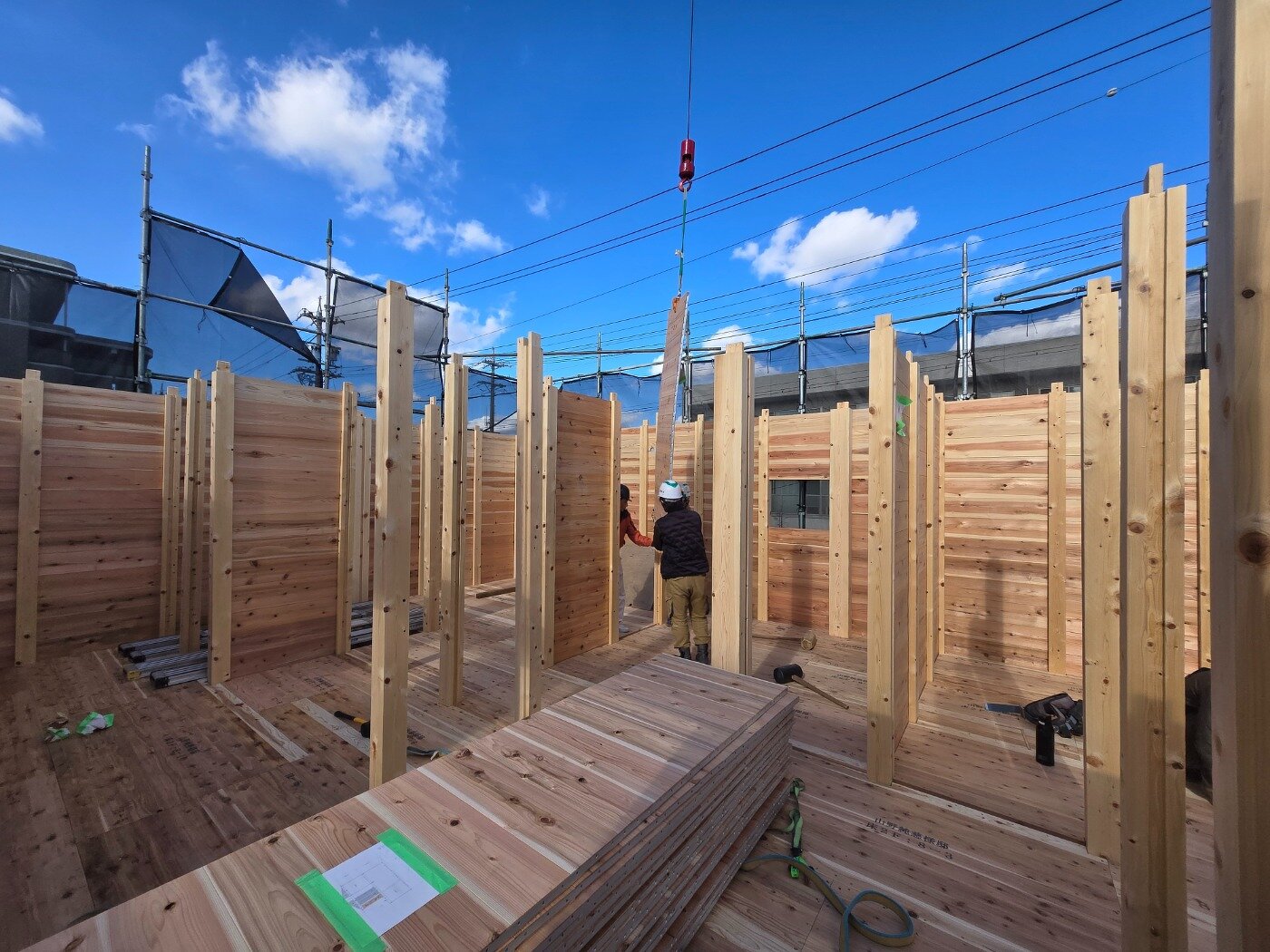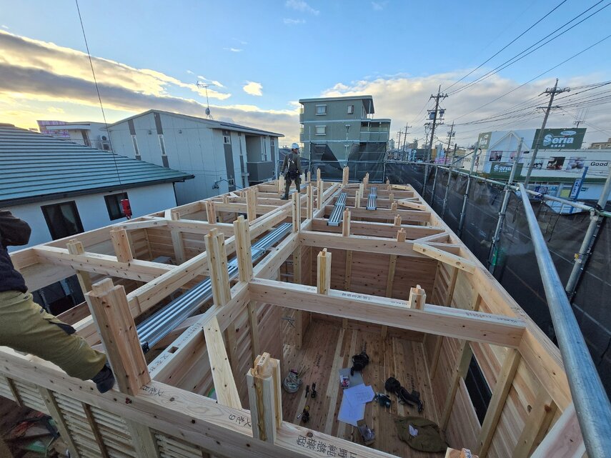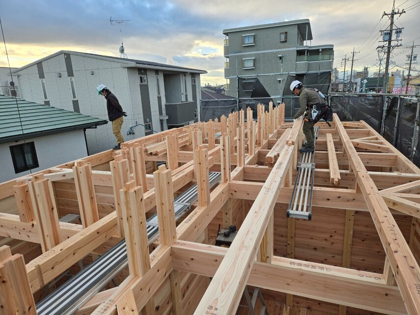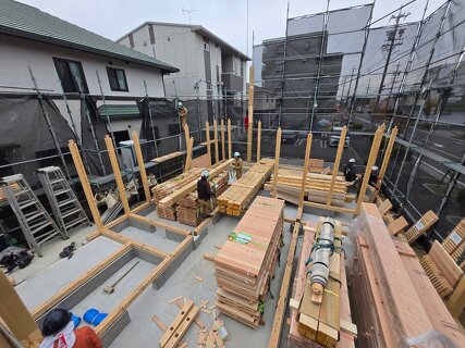 柱やパネルが組み上がり、だんだんと建物の形が見えてきました。 家づくりが少しずつ実感できる工程です。