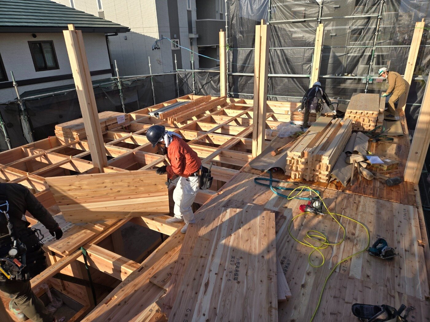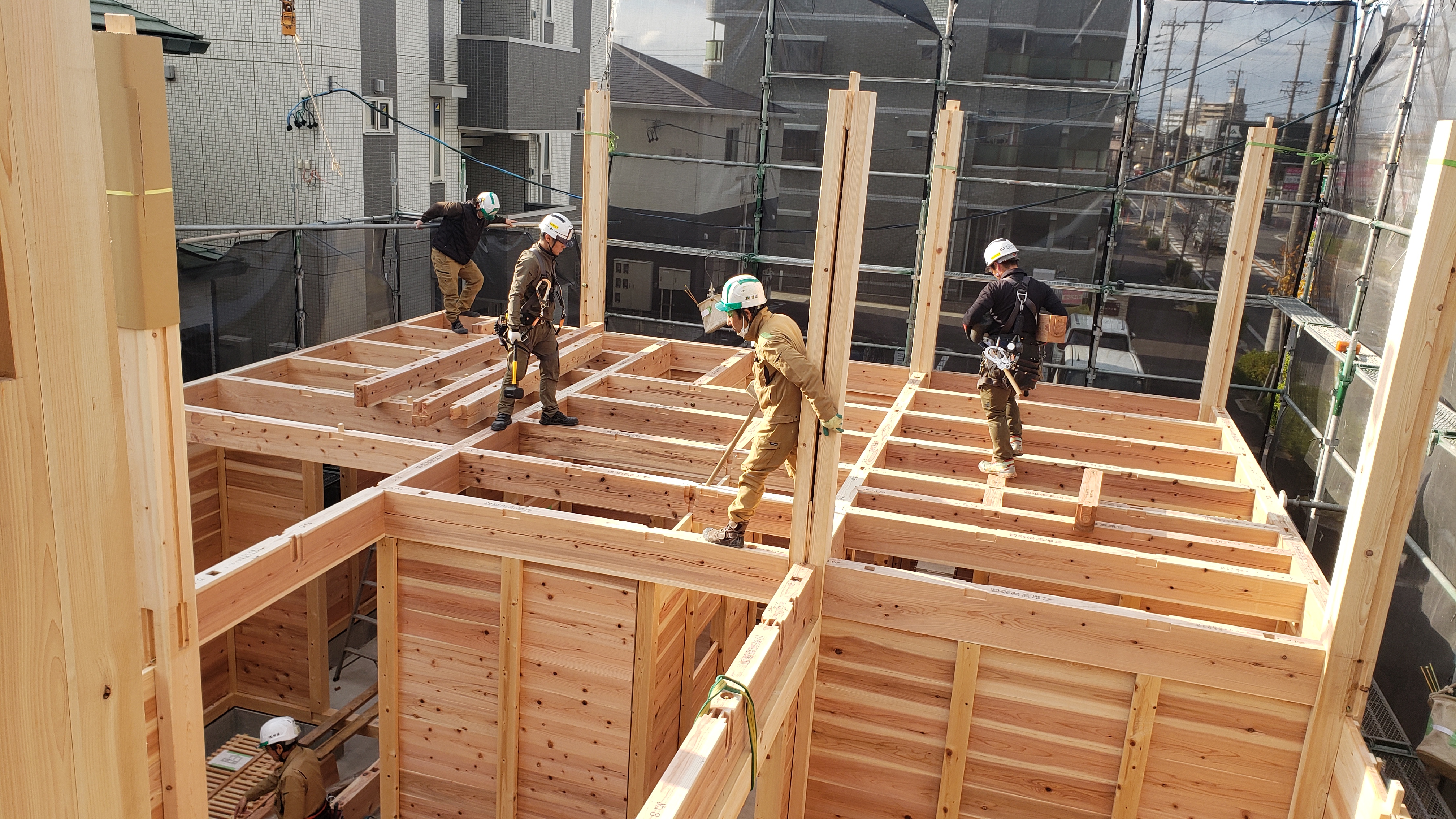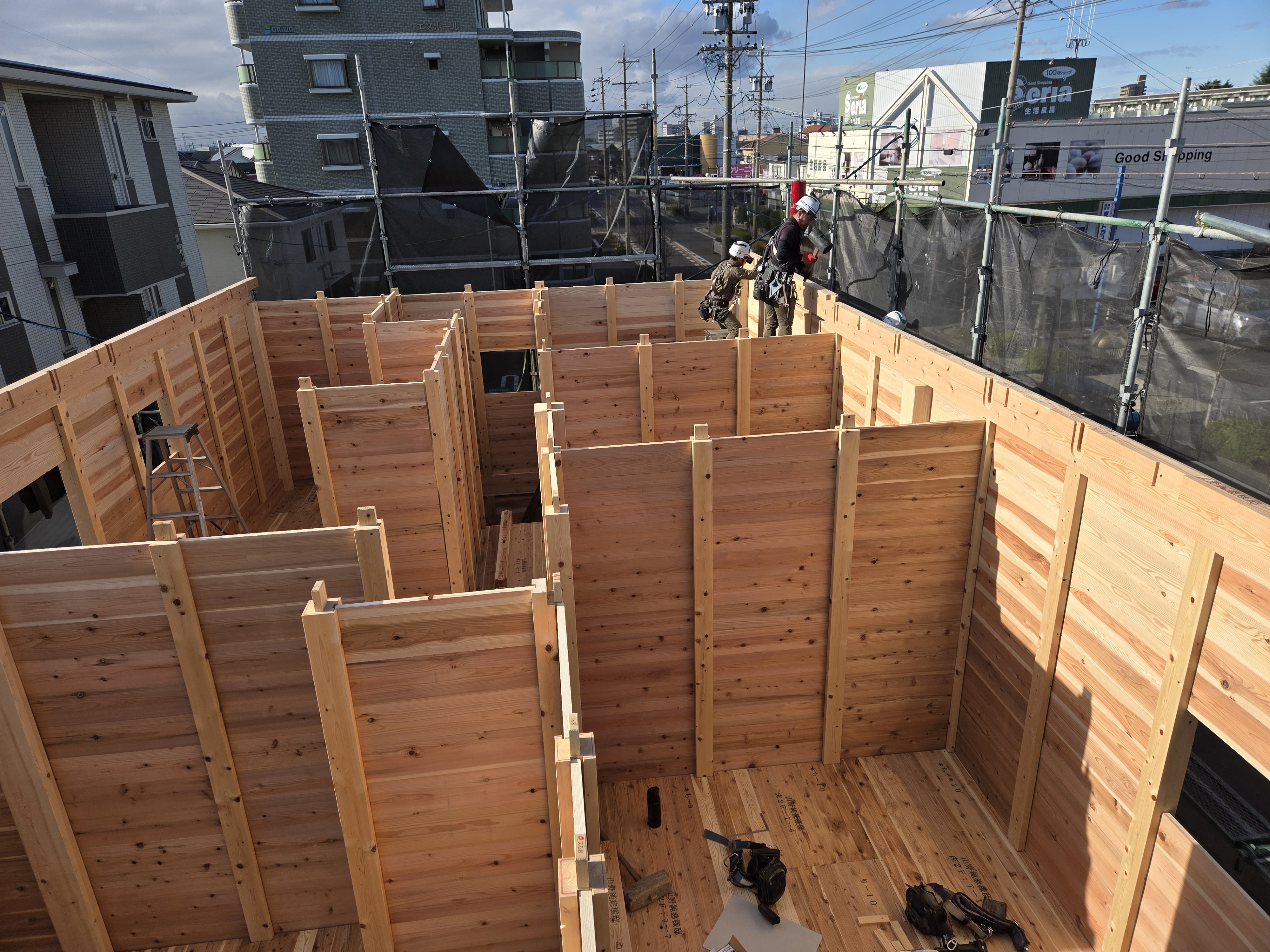 柱やパネルが組み上がり、だんだんと建物の形が見えてきました。 家づくりが少しずつ実感できる工程です。