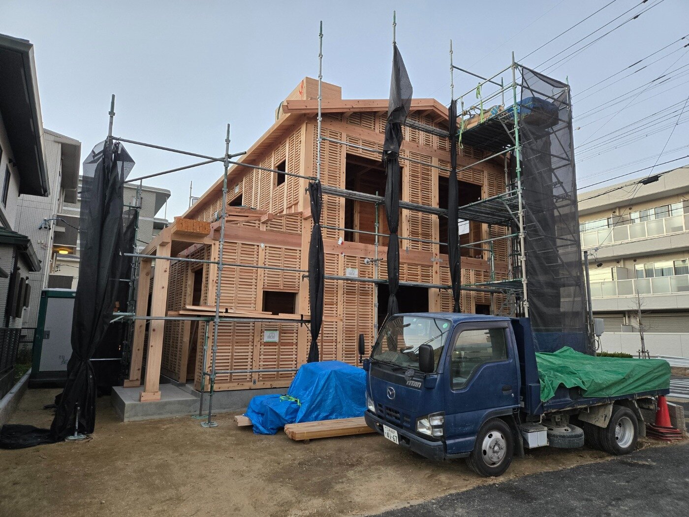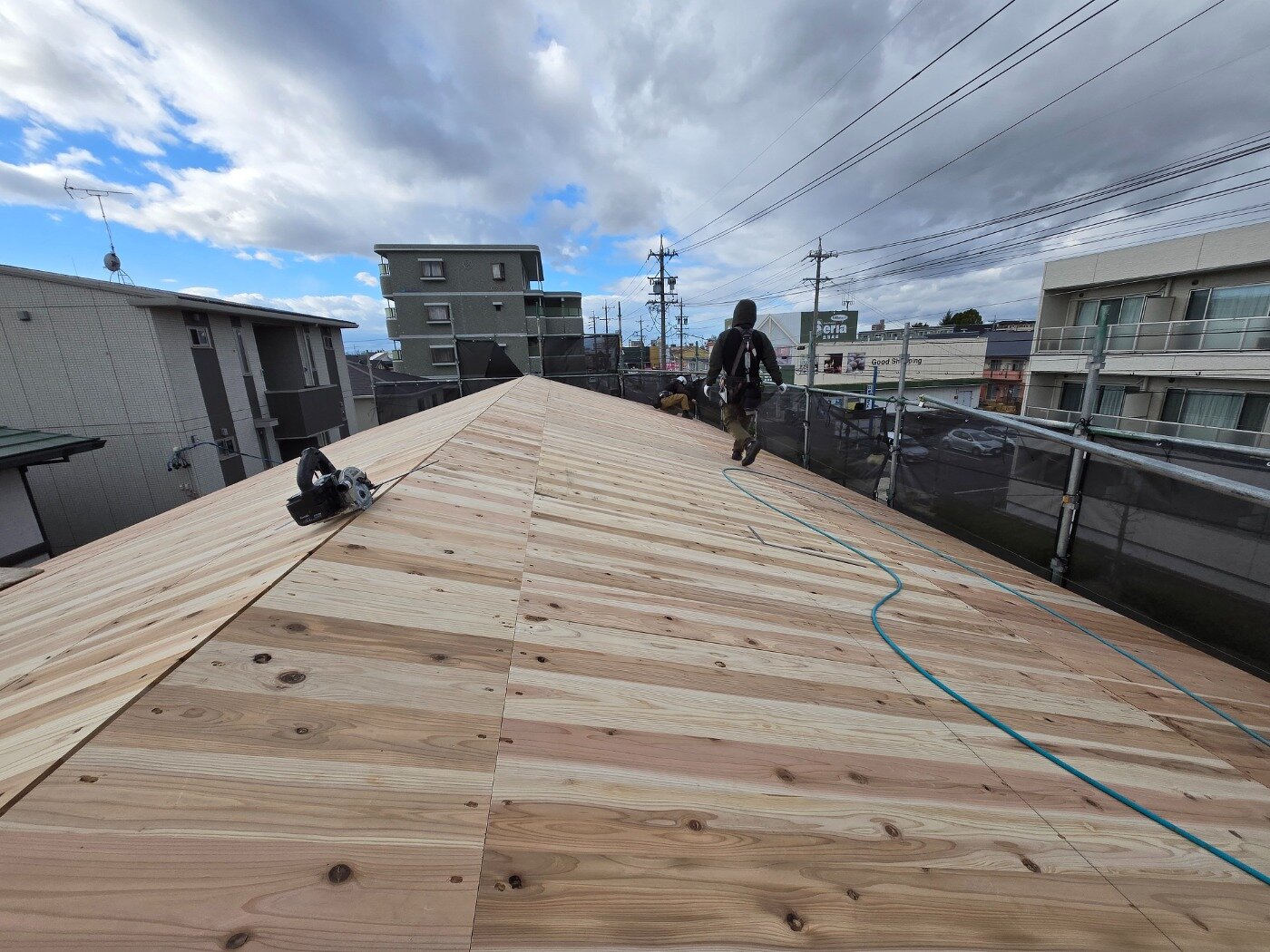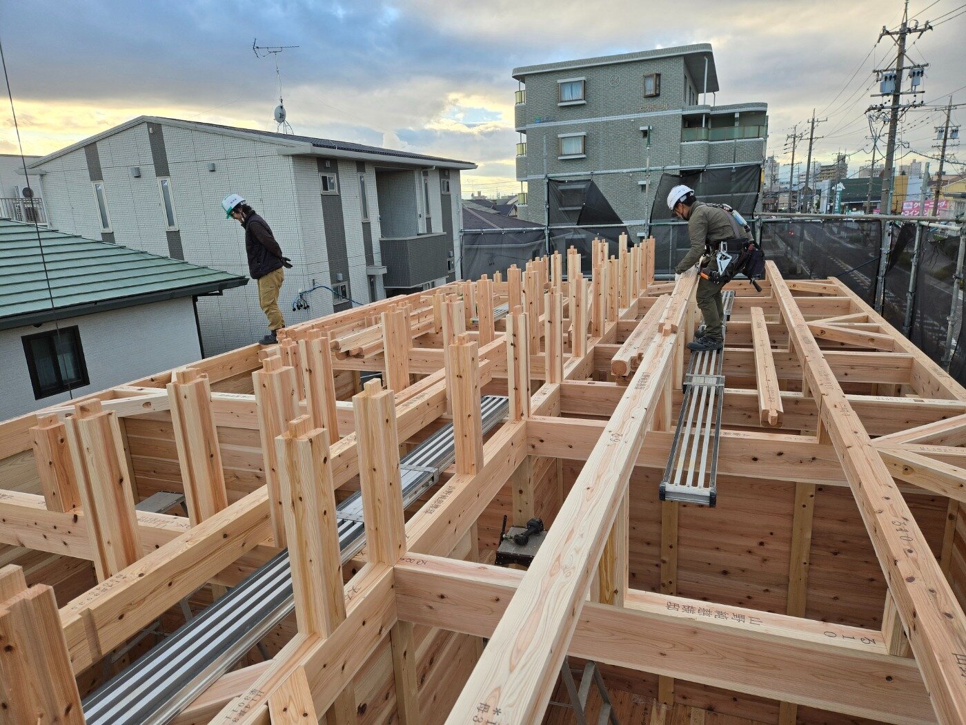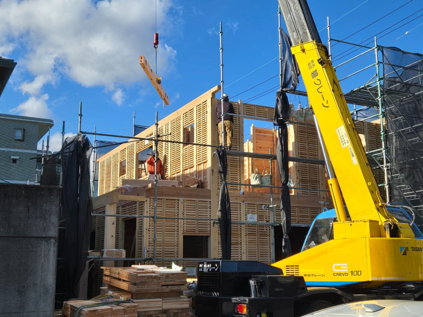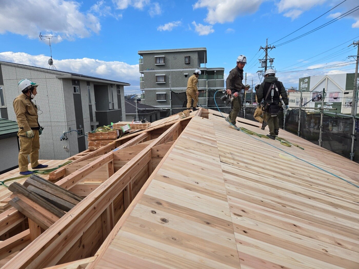 一日でここまで組み上がり、建物の全体像がはっきりと見えてきました。 これから仕上げ工事へと進んでいきます。