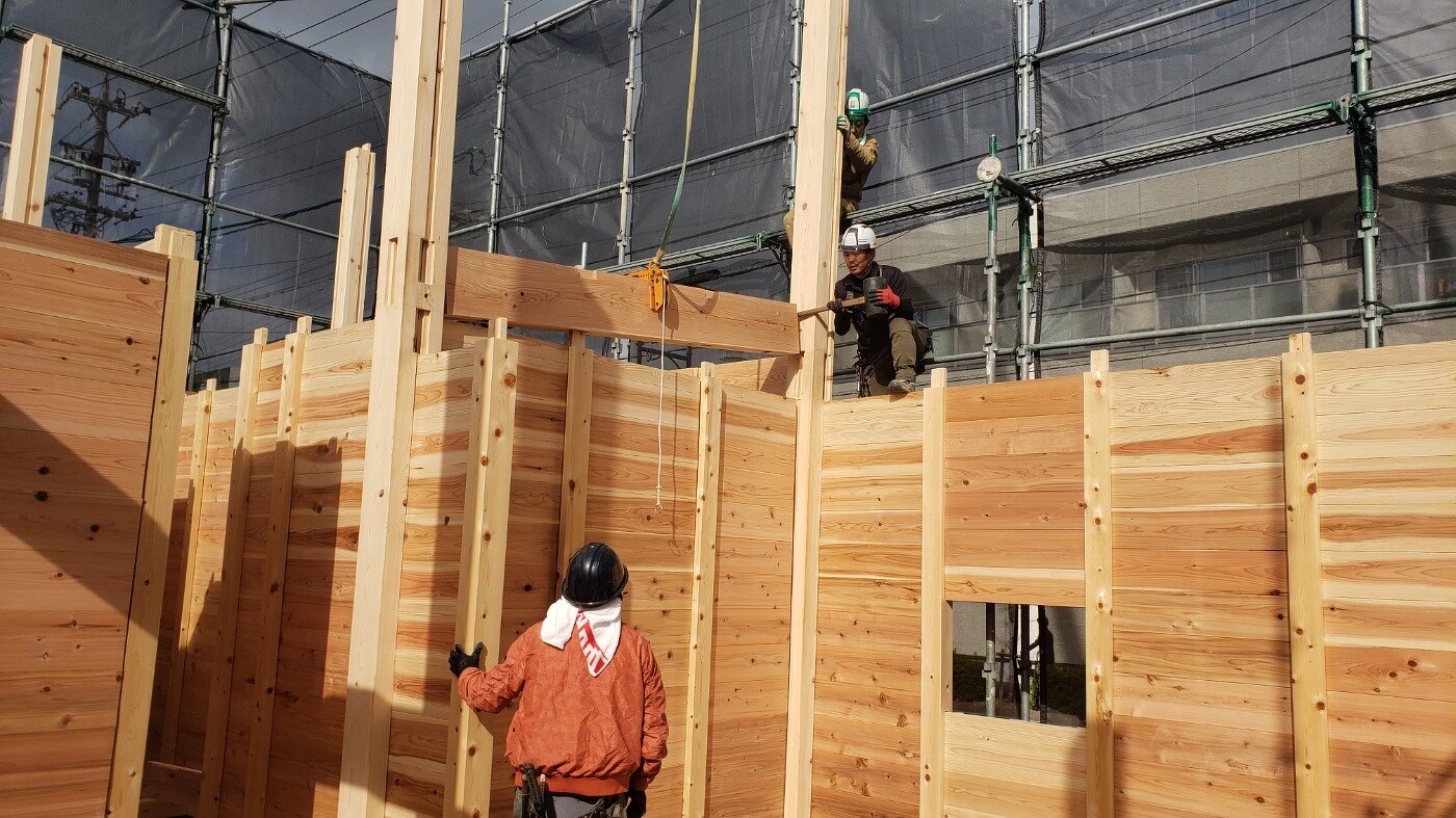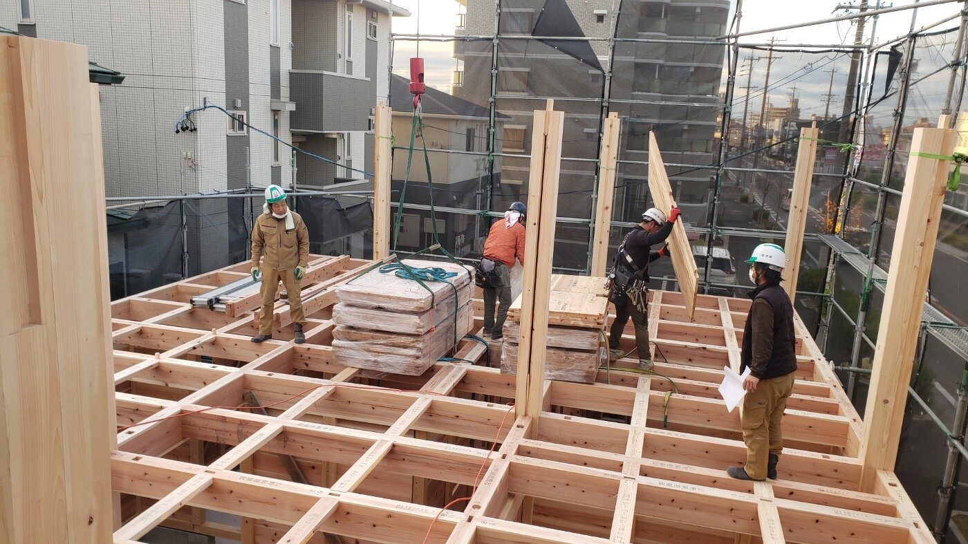 1階の落としパネルを入れていきます。 その後、2階の床板を施工し、2階の柱まで組み上げていきます。 50坪の2階建てのお家 木の家に住もうぜ!1648万の家(2階建てシリーズ)