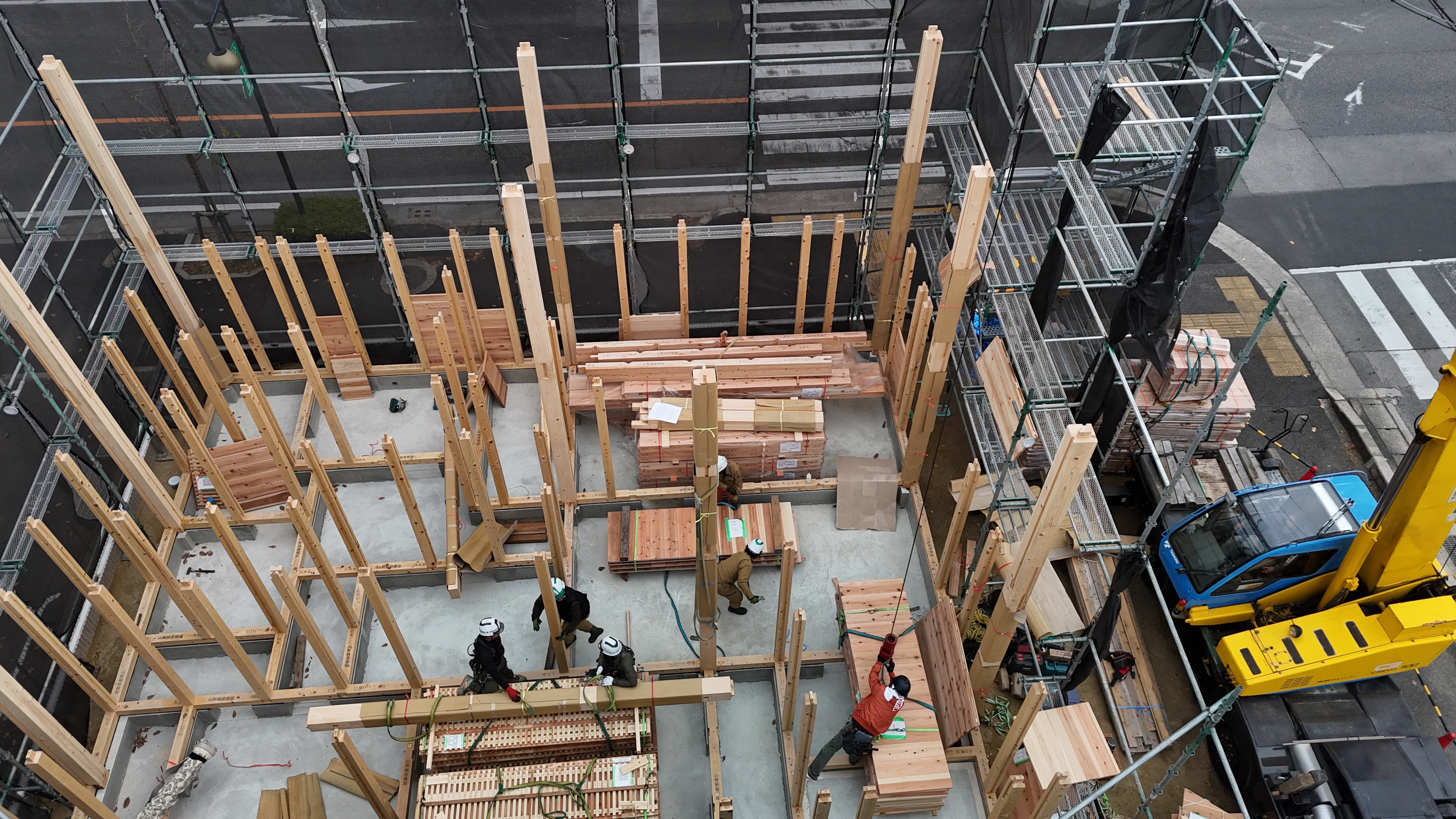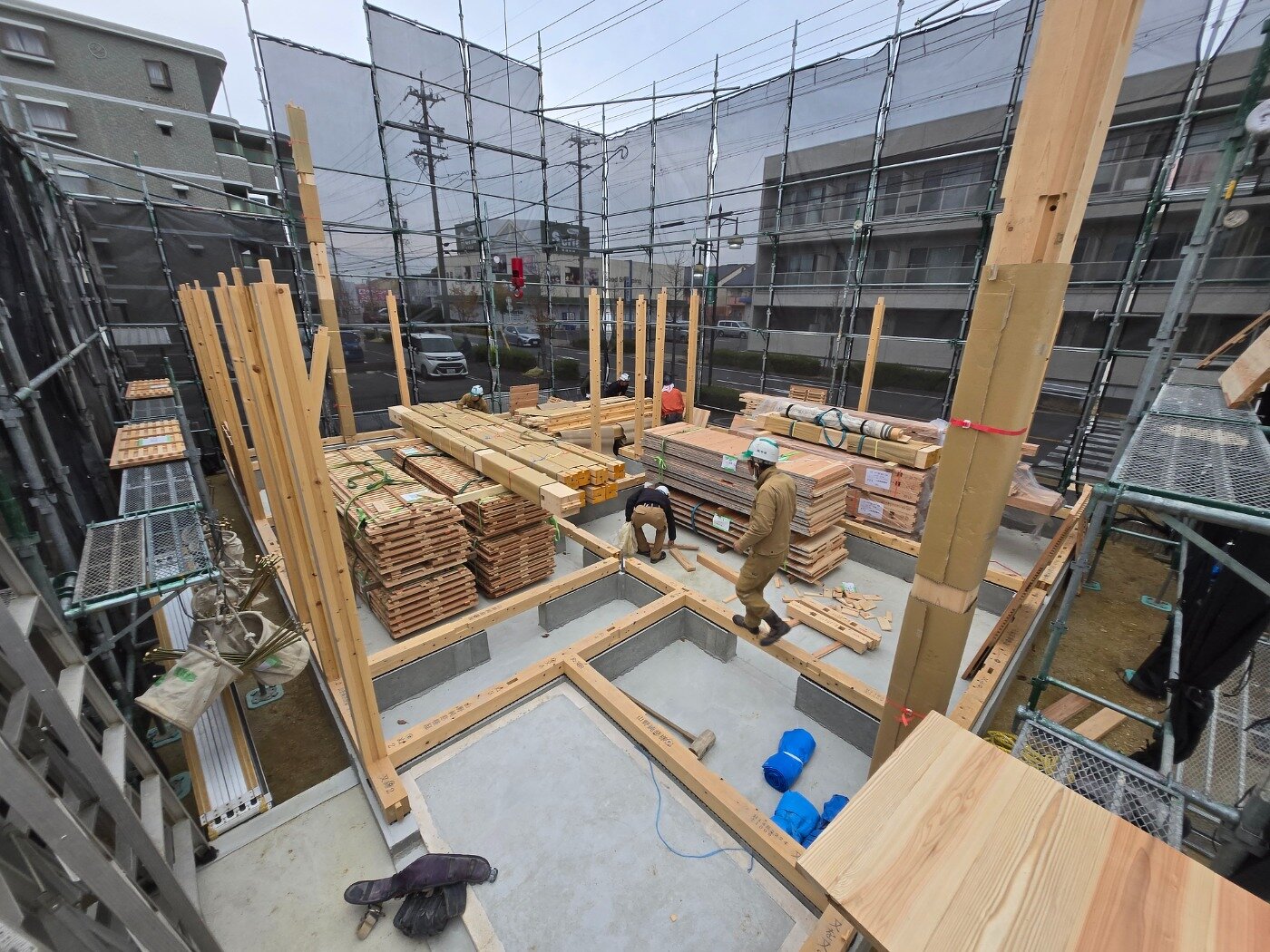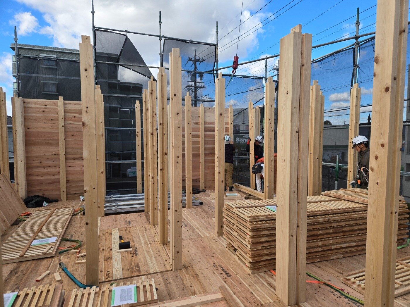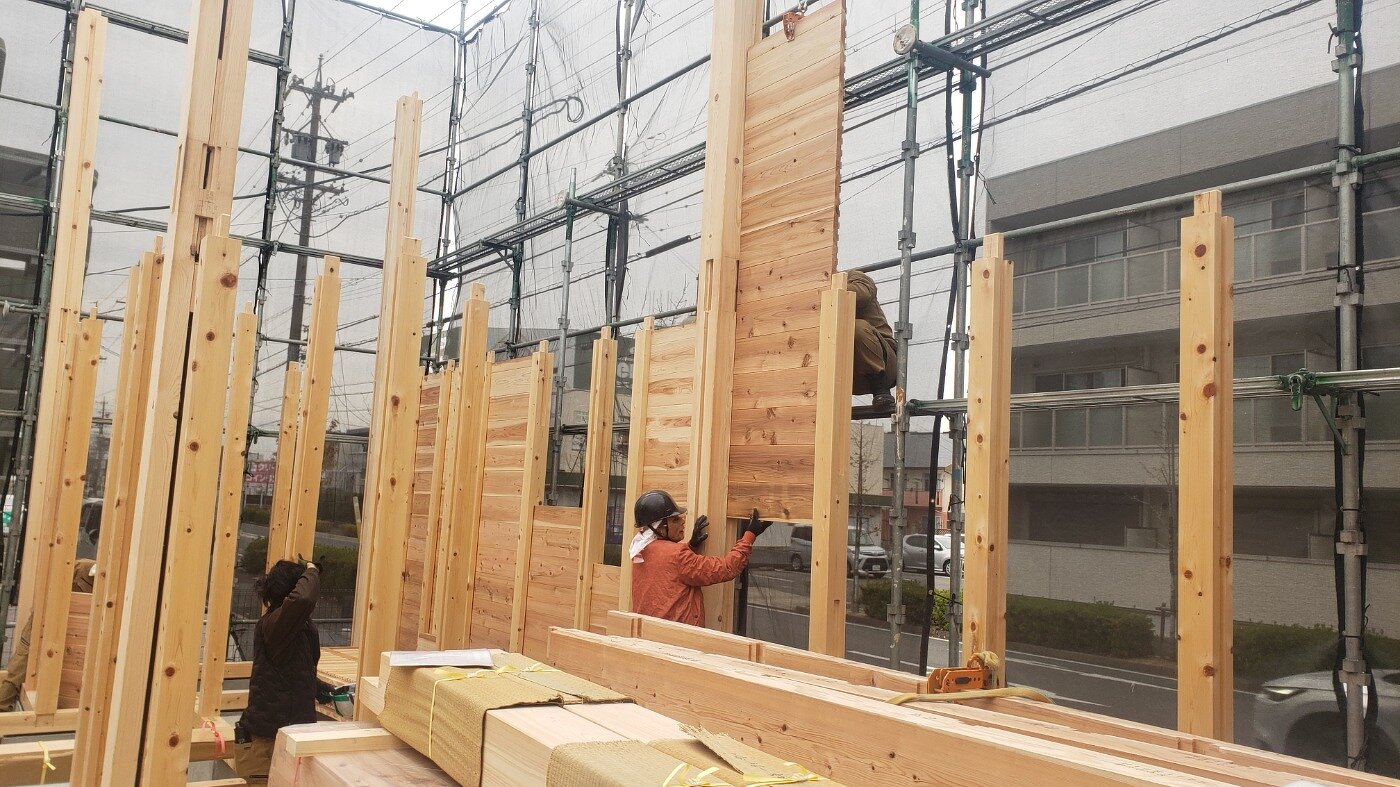 現現場では、まず柱を立てていき、落としパネルを入れる準備を進めます。 少しずつ、建物のかたちが見えてくる工程です。
