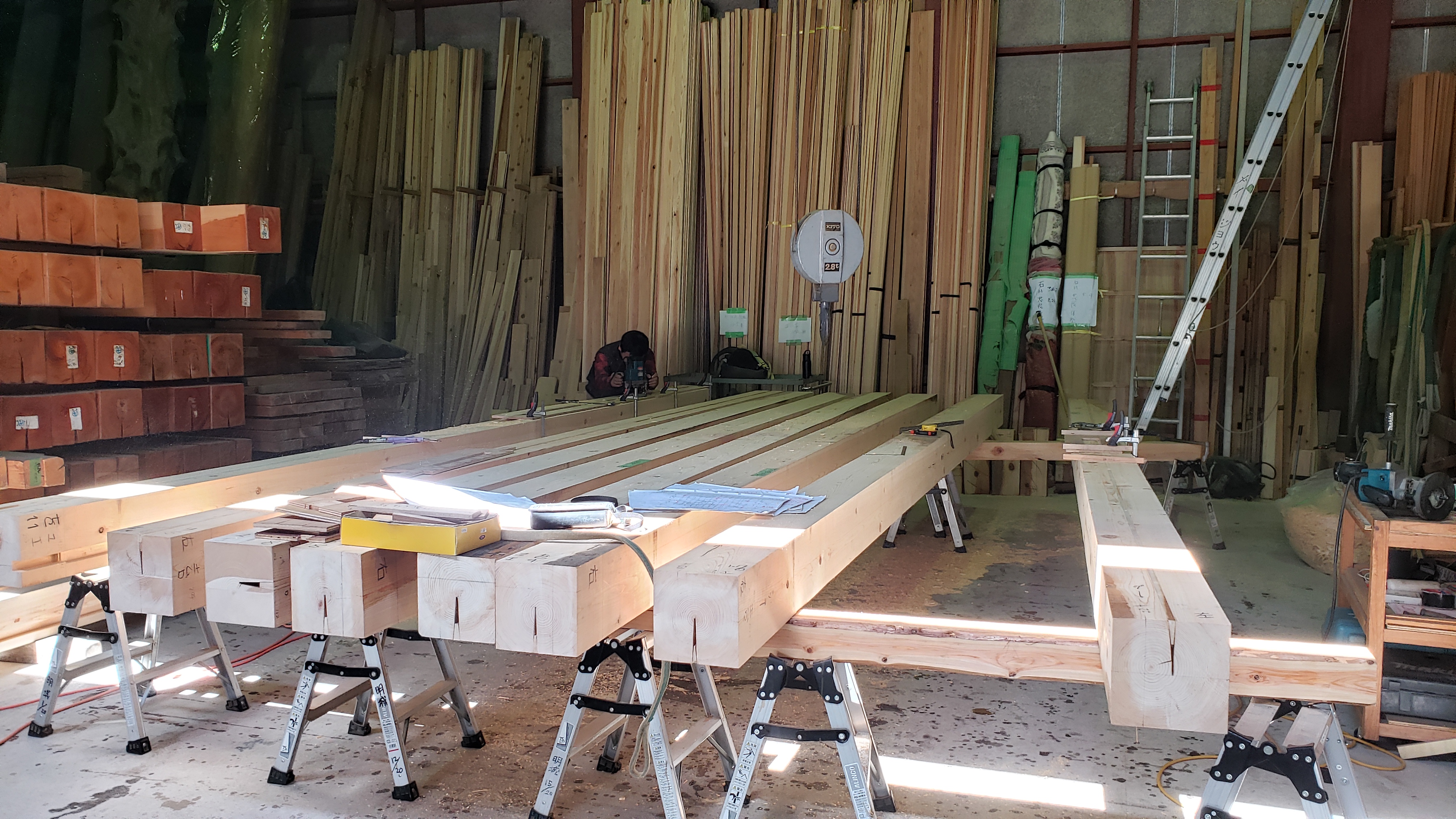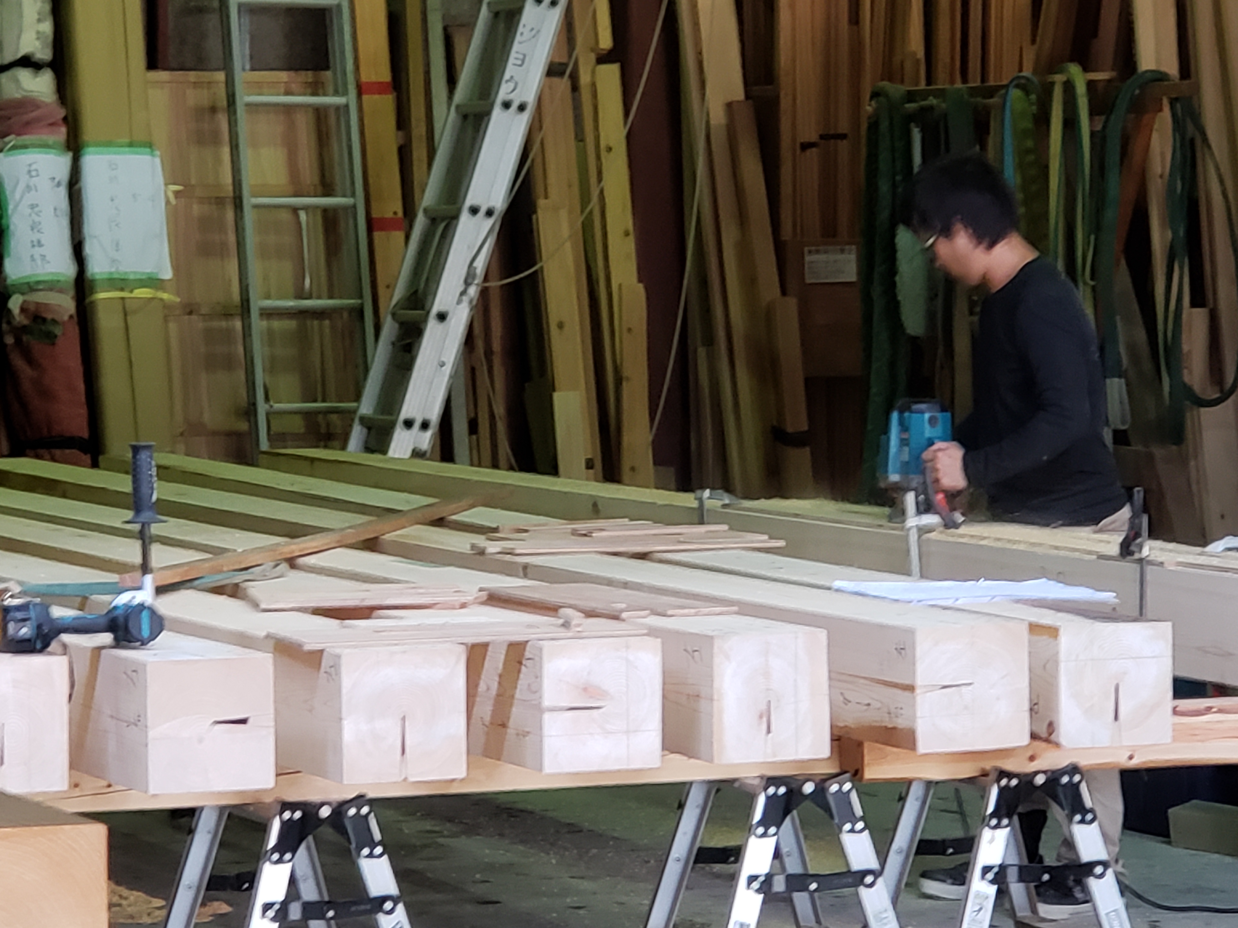 2階建てには、通し柱を使います 当社では 通し柱を 加工場に持参し製材します 正確に四角形に 加工し直角にします 特殊な材料は 多くの業者と協力して その時の最善の方法にて 進めていきます 50坪の2階建てのお家 木の家に住もうぜ!1648万の家(2階建てシリーズ)