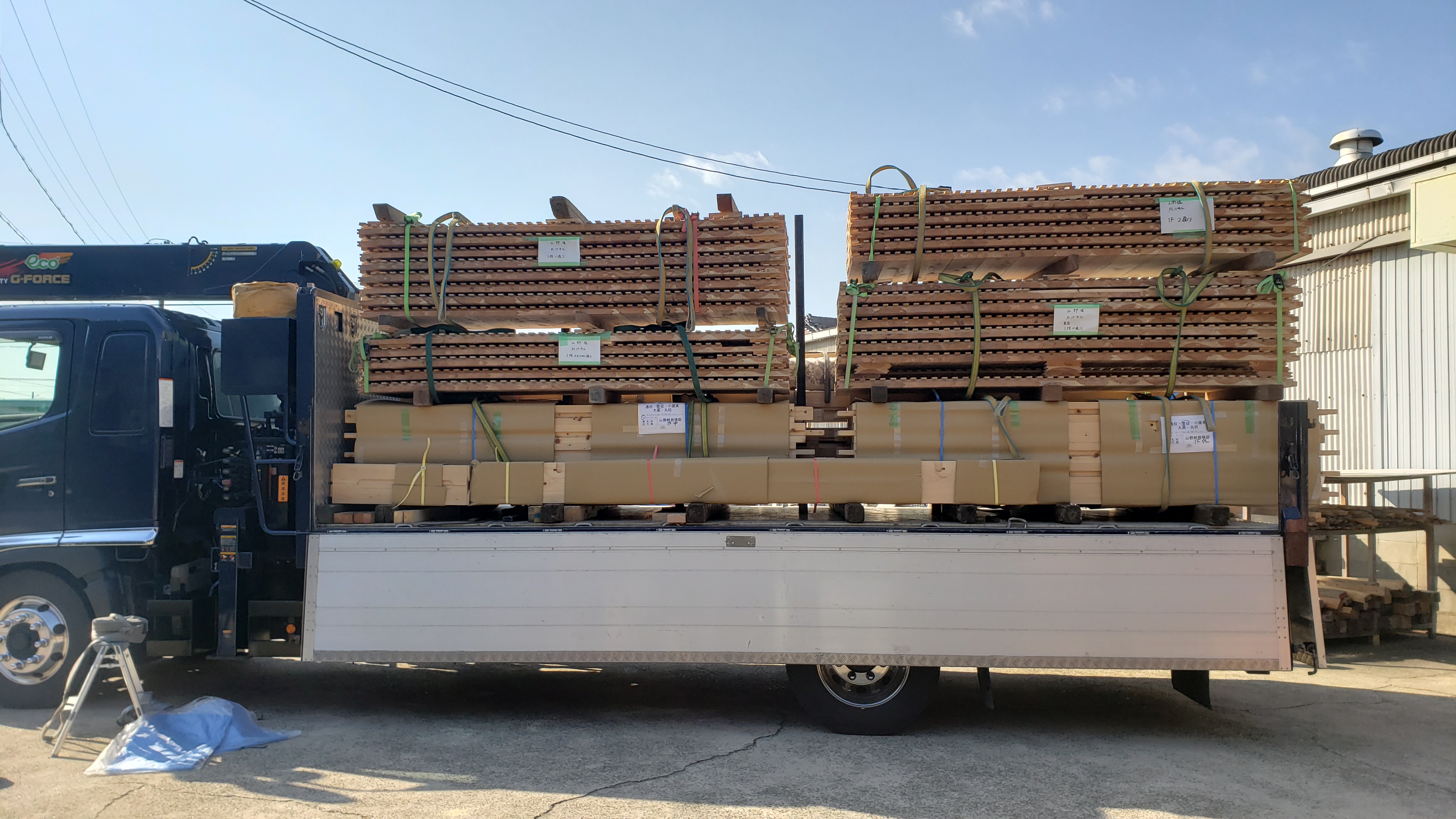 2階建ての建前が始まりました。 工場で加工した材料をトラックに積み込み、いよいよ建前へ向かいます。 50坪の2階建てのお家 木の家に住もうぜ!1648万の家(2階建てシリーズ)